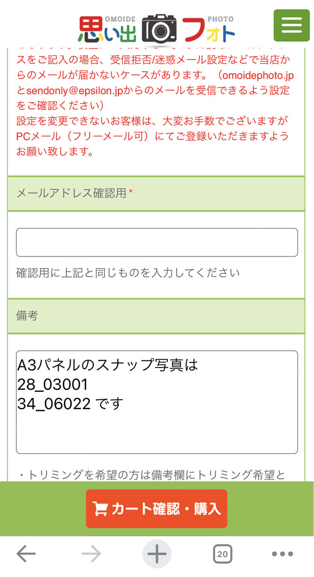 ⑥「ご注文者様」の情報を入力後、備考欄にA3パネルに入れたいスナップ写真2枚の写真NOを入力ください。